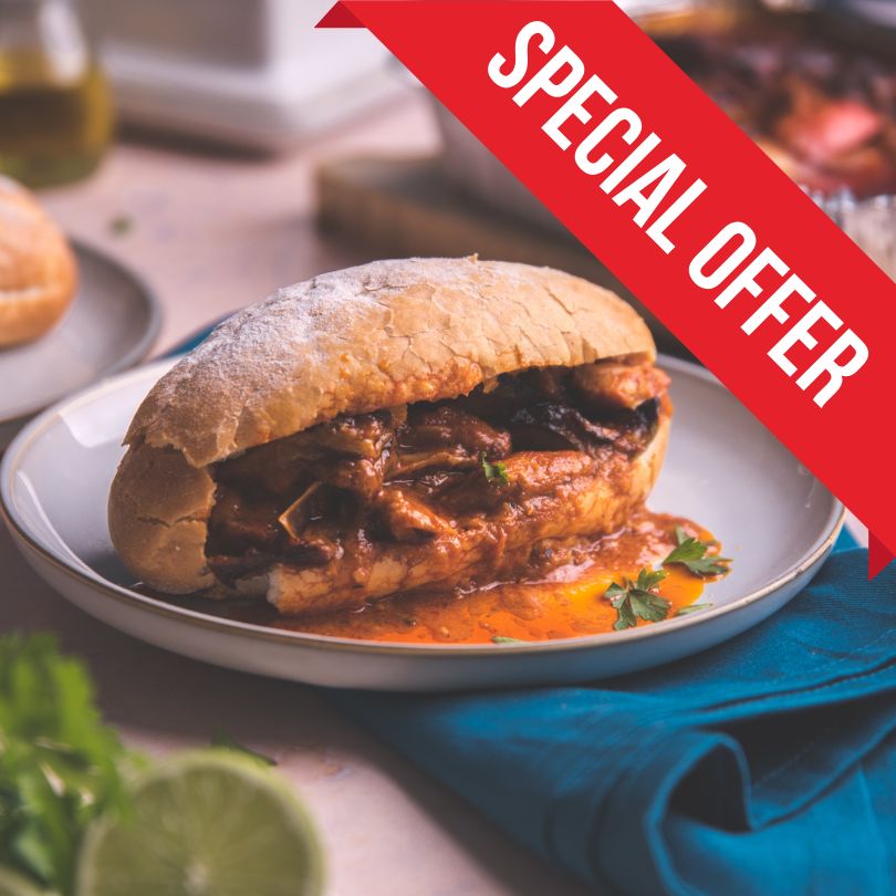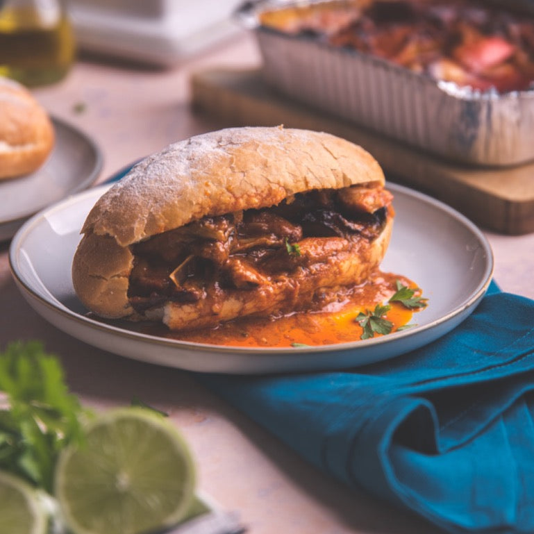 Free range deboned skin on chicken thighs in a Portuguese trinchado sauce with cream, mixed peppers, onion & parsley